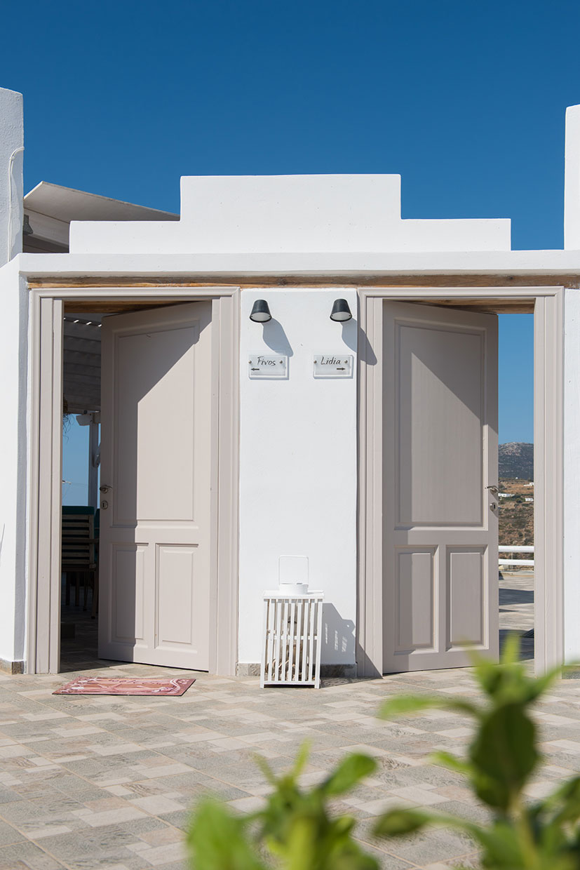 Στον εξωτερικό του χώρο κυριαρχεί η πλακόστρωτη σκιασμένη αυλή με θέα στον βράχο της Χρυσοπηγής και στη θάλασσα. Η βεράντα διαθέτει ξαπλώστρες, καθιστικό, τραπεζαρία ενώ πολύχρωμα λουλούδια και ιδιαίτερα διακοσμητικά στοιχεία συμπληρώνουν το σκηνικό.
